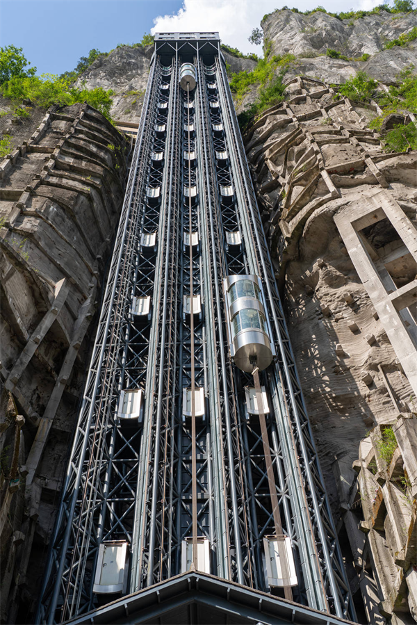 天龙旋梯由三台双层全景观光电梯并列分体运行,每台一次载客52人,运行速度为每秒3米,三台同时运行1天客运量达15000人次。其运行高度115米,从顶端到谷底仅需60秒。