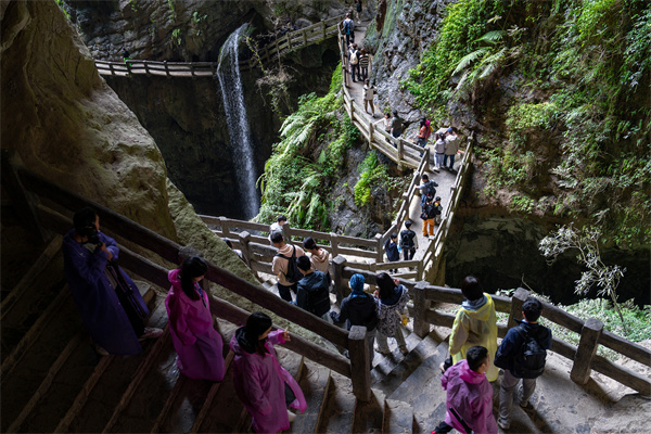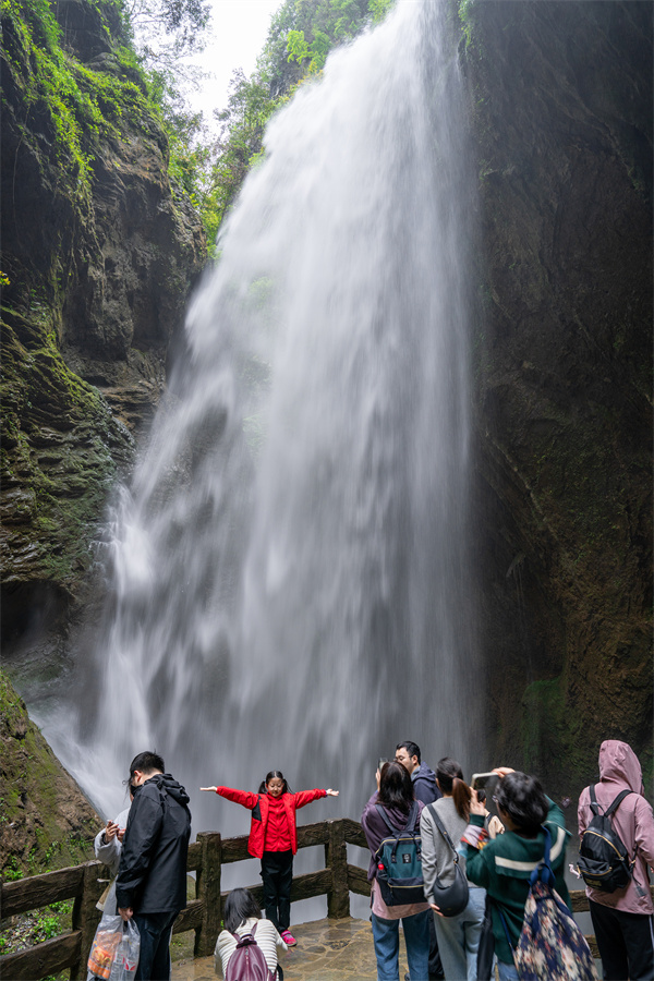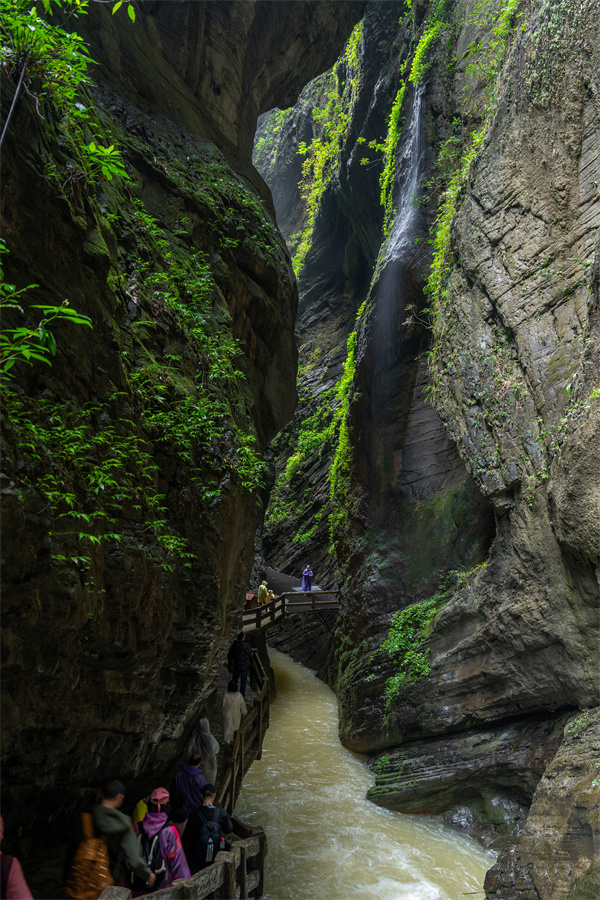 被誉为“地球最美裂痕”的龙水峡地缝景区经过雨水的洗礼后,空气清新、景色养眼,银河飞瀑、地下暗河水水量充沛,比平日景色更加绝美壮观,吸引众多游客到此观天险、访绝景。