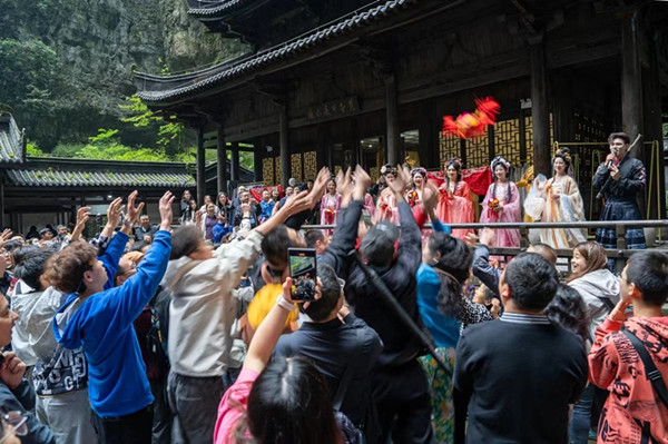 五一期间,游客不仅能够欣赏到世界自然遗产风光,还会邂逅不少“惊喜”。仙女山、天生三桥景区,特别上新假日宠粉活动“仙侠国风趣武隆”,带领游客穿越古今。“仙女游园”—邂逅七仙女,共赏山间轻舞;“抛绣球结缘”—接住仙女的满满祝福;“捕快巡游”—与高颜值男捕快趣味互动,感受古代衙门的独特魅力;“欢乐套圈、壶里壶涂”—重温儿时美好时光。游客纷纷参与,欢声笑语不断。