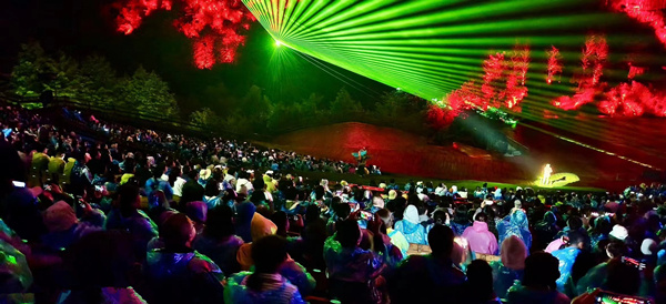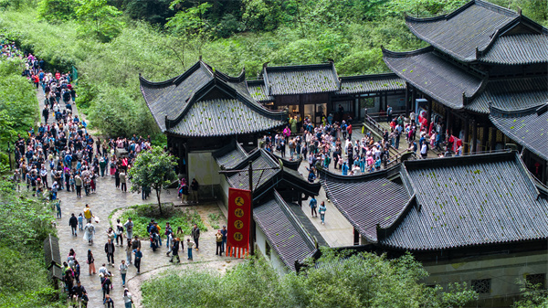 与此同时,今年五一期间,以国家非物质文化遗产“川江号子”为主题的大型山水实景演出“印象武隆”也是场场爆满,备受游客朋友青睐。晚上8点,在喀斯特地貌形成的天然剧场内,游客坐在落差200米的峡谷里,聆听非物质文化遗产“川江号子”,感受跨越千年的民俗文化。