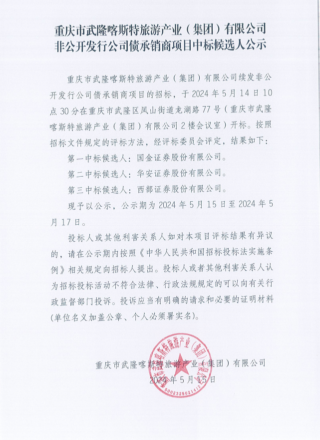 重庆市武隆喀斯特澳网官方网站产业(集团)有限公司非公开发行公司债承销商项目中标候选人公示