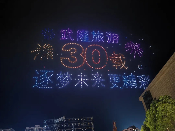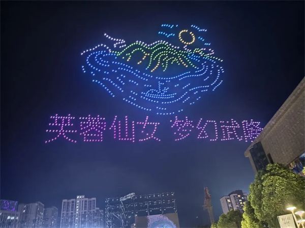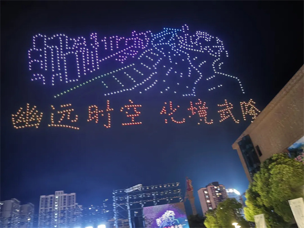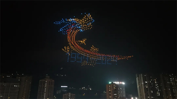1000架闪烁着霓虹灯的无人机缓缓升空,按设定程序在空中快速编队、悬停,不断地变化阵型,组合成“龙”“芙蓉洞、芙蓉江”“仙女山观光小火车”“天生三桥”“印象隆”“武隆城市剪影”“仙女山机场”“逐梦未来更精彩”等主题的字体和图案,与炫彩夺目的城市夜景交相辉映,为市民和游客呈现了一场独有的视觉盛宴。整场无人机表演持续了15分钟,犹如一场精彩的空中电影。