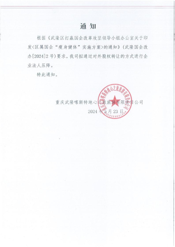 关于重庆武隆喀斯特地心之旅澳网官方网站有限责任公司股权转让的通知