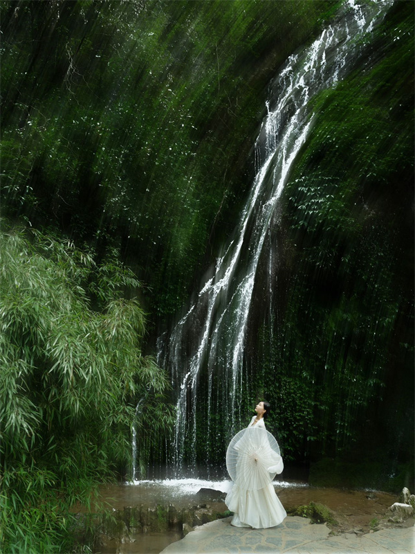 路过古老的天福官驿,穿越小径,来到天生三桥这方竹林深处的秘境,飞瀑流泉顺着崖壁徐徐落入山涧之中,迎上随风吹过来的水雾,这是一场山与水的奇妙交响。而在这片时空里,江湖的气息弥漫在每一个角落里。