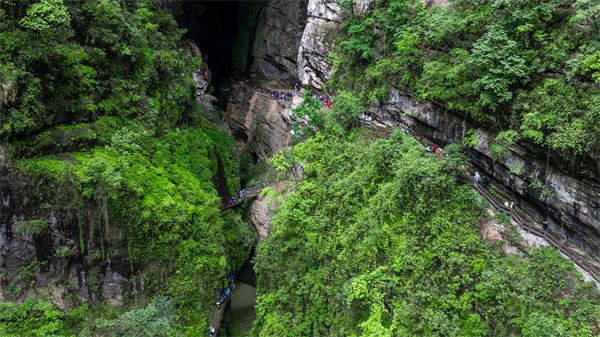龙水峡地缝游客沿着蜿蜒曲折的栈道欣赏美景