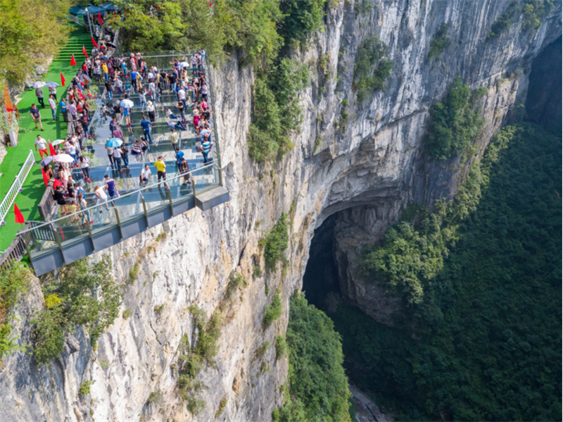 其实,天生三桥除了这个网红打卡点外,还有科幻片既视感拉满、亚洲首部景区内360°旋转观光电梯——“天龙旋梯”;《满城尽带黄金甲》唯一外景拍摄地——古色醇香的天福官驿;建于跨度最大的天生三桥天龙桥悬崖顶上,全透明透视感、可360度俯瞰喀斯特地貌的天生三桥玻璃眺台等。