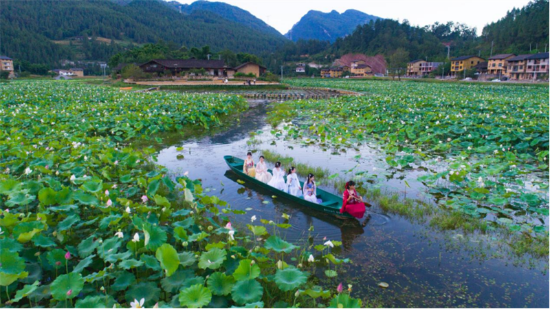 正是荷花开满池,便是人间好时节。武隆大田湿地人家,是深山环绕的小村落,游客在这里可观湖中荷花绽放,赏湖岸百花争艳,任湖内柳舟穿行,看藻丛游鱼戏逐,享古寨原生态生活。误入藕花深处,惊起一滩鸥鹭。