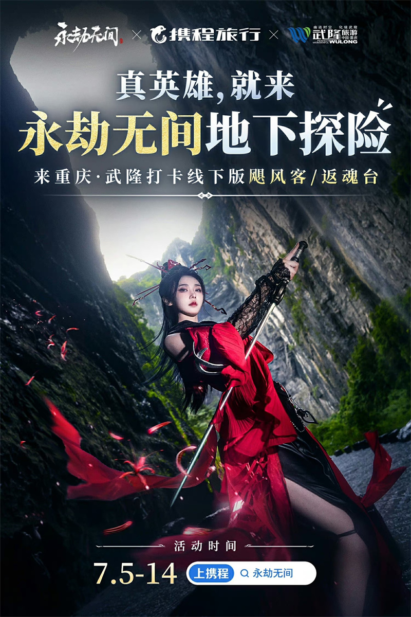 永劫无间迎来3周年庆,联合武隆景区举办了线下《永劫无间寻宝活动》,只要你在携程购买专属门票后,就可以到天生三桥、龙水峡地缝景区领取《永劫无间》的寻宝地图,完成打卡任务,领取相关周边产品,快来和新英雄张起灵一起探寻地下世界吧!