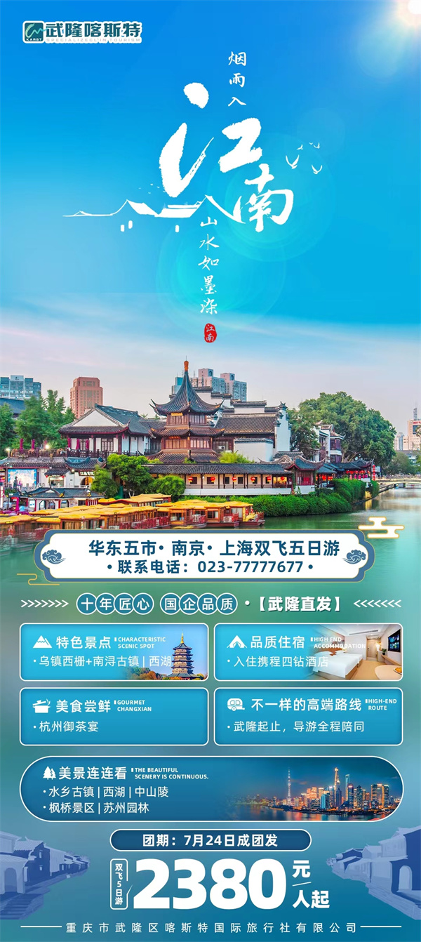 华东五市双飞纯玩品质5日游-【烟雨入江南】7月24日成团发。武隆起止全陪班,全程精选携程四钻酒店,特别安排一晚乌镇外住宿体验。双水乡、乌镇西栅+南浔古镇,西湖、枫桥、七里山塘、外滩等精华景点。特色美食:南京盐水鸭、杭州龙井御茶宴。服务热线:023-77777677。