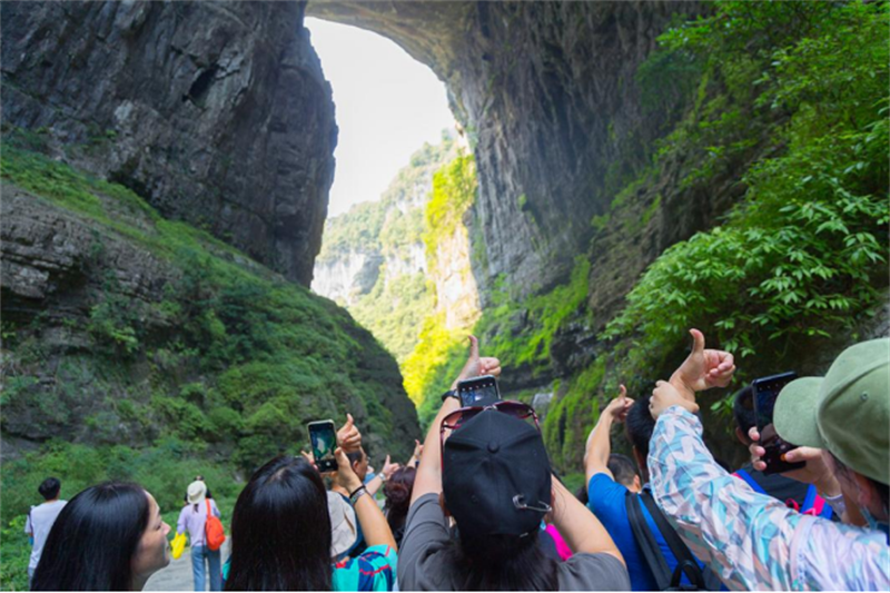 考察团随后来到天生三桥,刚下观光电梯,如洞开天门的天龙桥豁然林立,气势磅礴的天然石桥,就引得得嘉宾纷纷掏出手机拍照留影。悬崖万丈,折服于大自然神奇的造物能力,嘉宾们不时在众多特色景点前停下脚步,与同行好友打卡留念。雄浑壮观的天生石桥、古色醇香的天福官驿、鬼斧神工的独特形状,让嘉宾赞不绝口。考察团纷纷赞叹:“武隆真的是个特别美、特别好的地方,回去后我会推荐给更多的朋友,让他们一定要来一次武隆,也欢迎大家来台湾玩。”