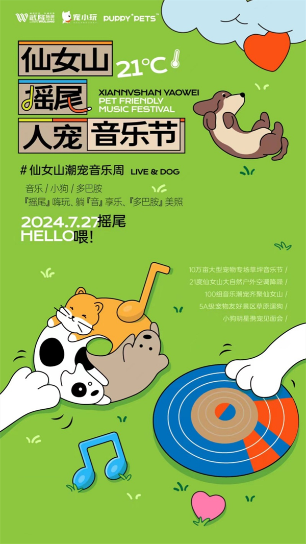 在8.17仙女山明星音乐节正式到来之前,这周末(7月27日),武隆景区诚邀所有“铲屎官”,一起到仙女山体验“仙女山「摇尾」人宠音乐节”的独特魅力。这是一场以萌宠、音乐、多巴胺、躺平为主题打造的宠物友好大型户外草坪音乐节,将带您感受一次松弛、治愈、快乐的宠物音乐盛宴!