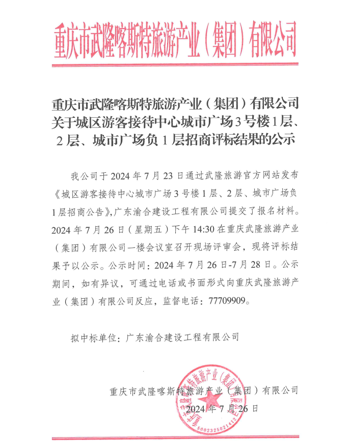 - 9重庆市武隆喀斯特澳网官方网站产业(集团)有限公司 关于城区游客接待中心城市广场3号楼1楼、2楼、负1楼招商公告