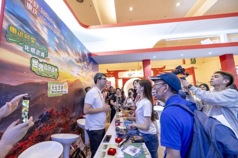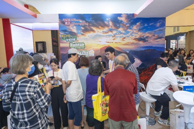 走进展会,中央大屏滚动播放的重庆文旅宣传片源源不断地将各国展商和观众引向中国展区,重庆展台全方位展示以长江三峡、世界自然遗产、世界文化遗产、8D魔幻都市为代表的重庆文旅资源,成为展区“最靓的仔”。