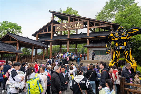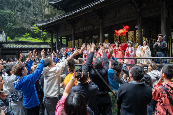 一大早,被誉为“亚洲最大天生石桥群”的天生三桥景区人头攒动,到处都是人山人海,一片热闹非凡景象。今年以来,天生三桥景区创新地推出“仙侠国风趣武隆”、仙女游园、捕快巡游、抛绣球结缘、变装打卡武侠世界、古趣投壶、射五毒等文旅趣味活动,吸引了众多游客体验打卡,景区人气高涨。