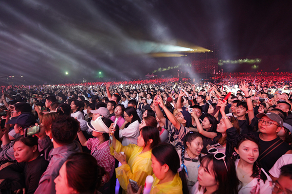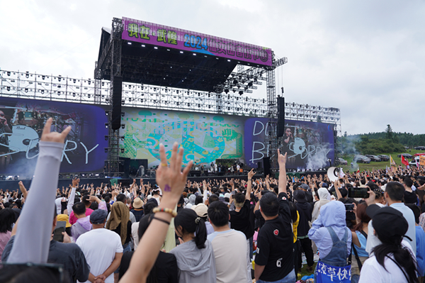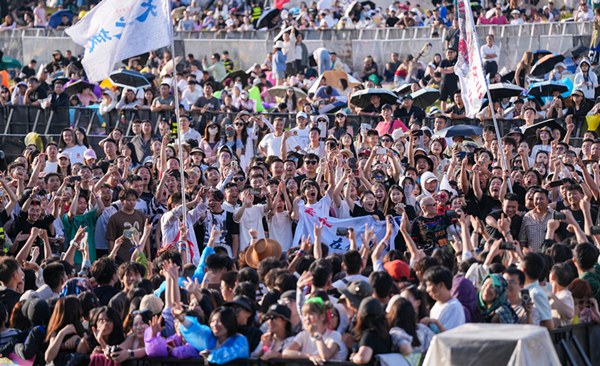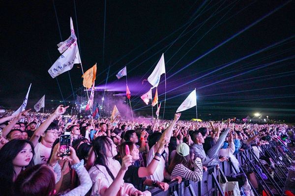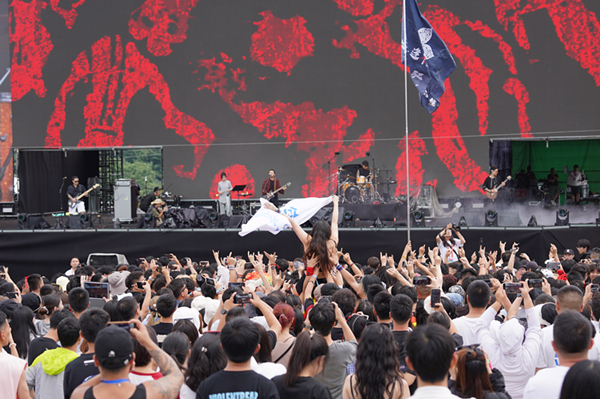 下午1点,随着激昂的旋律响起,痛仰乐队率先登场,他们以独特的音乐风格和激情四溢的表演,迅速点燃了现场的气氛。《再见杰克》《公路之歌》《西湖》等歌曲一出来,歌迷们热情高涨,开始花式摇滚狂欢,开火车、挥手蹦迪、摇头狂欢……人群与派对、尖叫与呐喊,欢呼声一浪接着一浪。