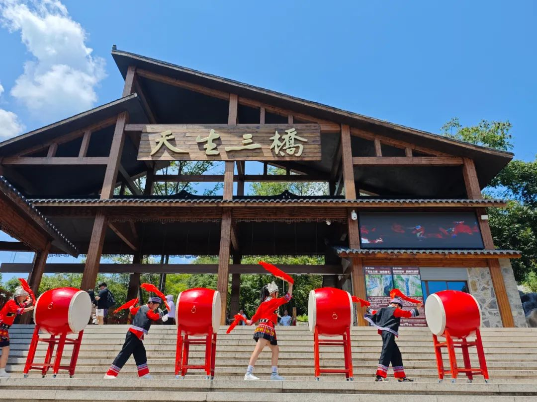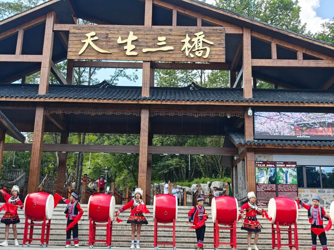 苗鼓声声,震撼心灵!鼓手们身着传统的苗族服饰,有力地挥舞着鼓槌,那节奏明快、富有力量的鼓声,在天生三桥的山谷间回荡,与大自然的鬼斧神工完美融合。