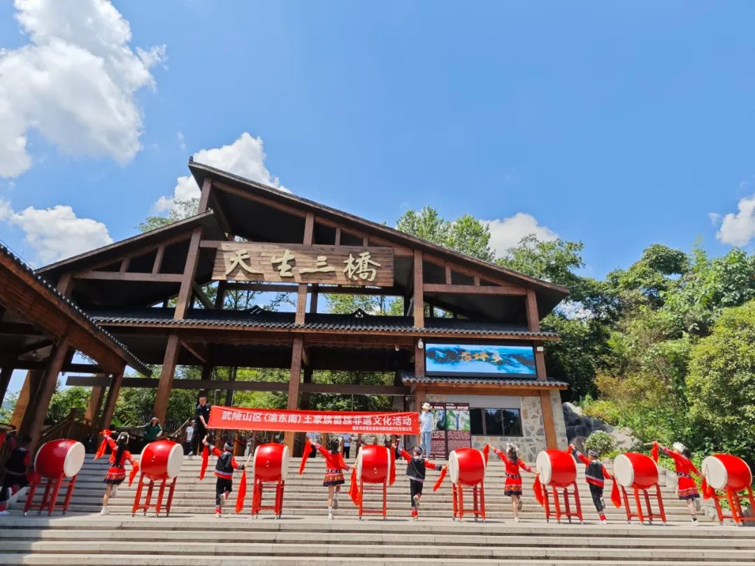 亲爱的朋友们,在武陵山区的渝东南,一场震撼人心的非遗文化盛宴——苗鼓快闪,在雄伟壮丽的天生三桥激情上演!