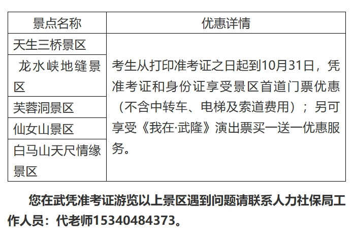 从打印准考证之日起至2024年10月31日,参加此次考试的考生们,凭准考证和身份证享受免仙女山、天生三桥、龙水峡地缝、芙蓉洞、白马山天尺情缘景区首道门票优惠(不含中转车、电梯及索道费用);还可享受《我在·武隆》演出票买一送一优惠服务。