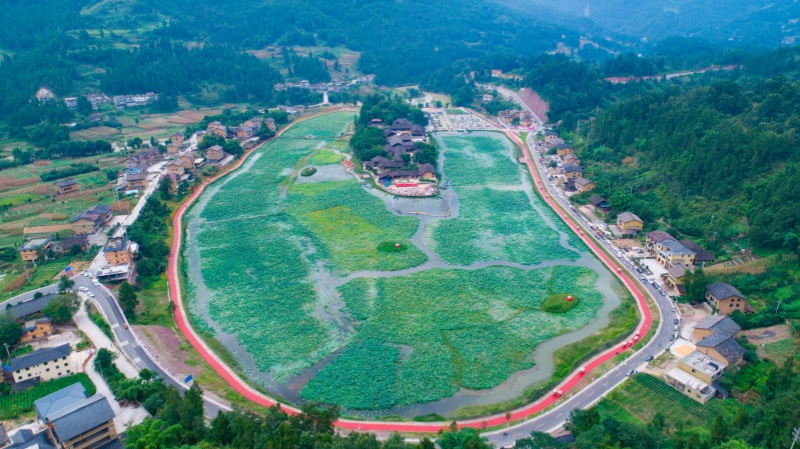 大田湿地人家,湖光山色间的宁静桃源,屋舍错落,田园与湿地交融的生态画卷。