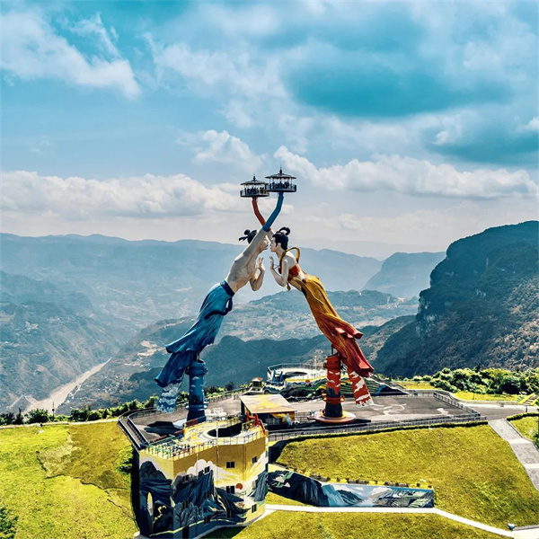 白马山与仙女山隔江相望,驻足望仙崖可远眺仙女山奇峰妙笔,缭绕仙姿,感受白龙马与青衣仙女的绝美爱情,网红打卡点“飞天之吻”的建造灵感也源于此。国庆假期,许多游客慕名而来,登上“飞天之吻”,纵观群山逶迤,云海苍茫;走进8D影院,直观地感受唯美爱情故事;漫步浪漫仙街,感受色彩斑斓的时尚和浪漫;步入冒险丛林,体验爱的冒险。