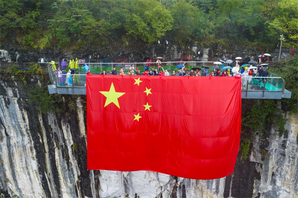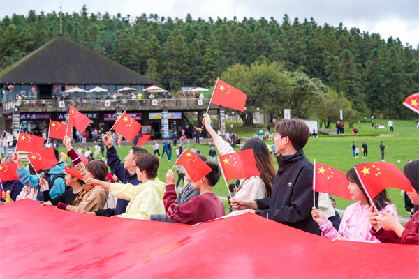 此外,仙女山景区、天生三桥景区巨幅国旗的传递活动更是将现场气氛推向了高潮。游客们手持国旗,深情献唱《我和我的祖国》,用歌声表达对祖国的热爱与祝福。