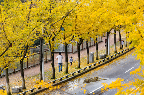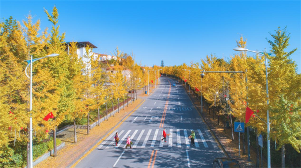 随着秋风的轻抚,部分银杏叶纷纷扬扬地飘落在树下各个角落,或是屋檐上、道路旁,色彩层次多样,宛如一场金色的雨,为这秋日增添了一抹亮色,也将整条大道装点得如梦似幻,最是美丽,也令人沉醉其中。