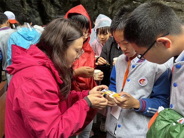 在仙女山森林科普教育基地和天生三桥地质科普教育基地,同学们通过沉浸式的课堂体验,深入理解了生态系统中各生物之间的相互依存关系、植被形态差异;探究了沉积岩的地质特点、喀斯特地貌的形成过程;他们现场进行溪水酸碱度实验,学会了小组讨论、协作共赢,懂得了自寻问题、自求解法,积极呈现分享实验结果。
