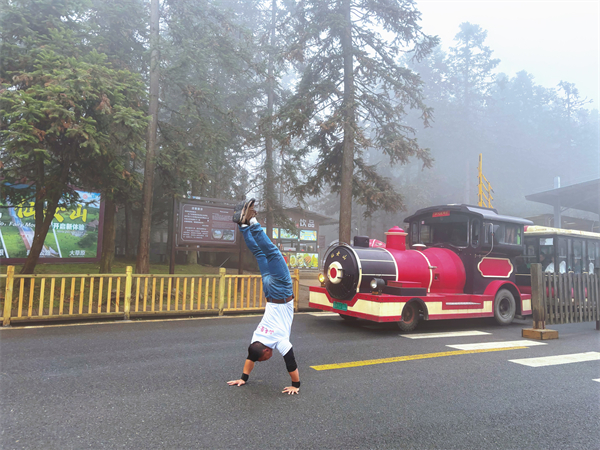 武隆倒立登山的第一站,他们来到了海拔1800米的仙女山。今日的仙女山,被大雾笼罩,正如他们坚持倒立登山的初心,即便面对重重迷雾与艰难险阻,也要奋力向前。这里的草原广阔无垠,森林茂密葱郁,仿佛是大自然精心雕琢的一幅画卷,而他们,正是这幅画中最勇敢的探险者。