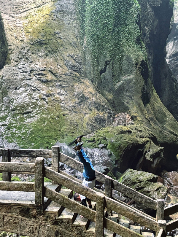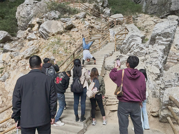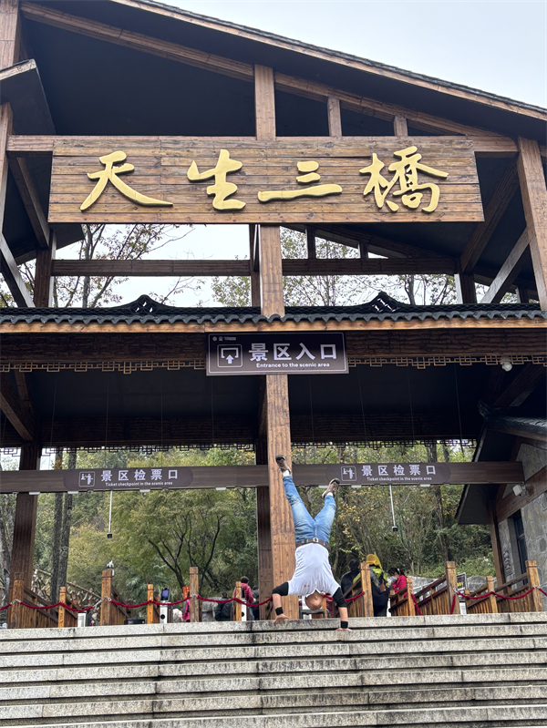 13日上午,龙水峡地缝迎来了这位勇敢的倒立登山者,作为其在武隆的终极挑战。这里峡谷幽深、溪流潺潺,两岸峭壁如削,形成了一道独特的风景线。但淅淅沥沥的的小雨也为他们的最后一站添了些许困难。台阶因雨水变得湿滑,每一步都充满挑战。失败接踵而至,一次一次的重来,他以不屈的精神继续前行。不论是在时空隧道、蛟龙寒窟,还是银河飞瀑等景点,他都以独立的姿态,留下了不可磨灭的印迹。