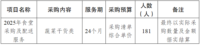 由于我司食堂固定供应商将到期,现重新开展食堂蔬菜干货类采购及配送服务比选工作,供货期24个月,采购内容包括蔬菜干货类(详见附件)。
