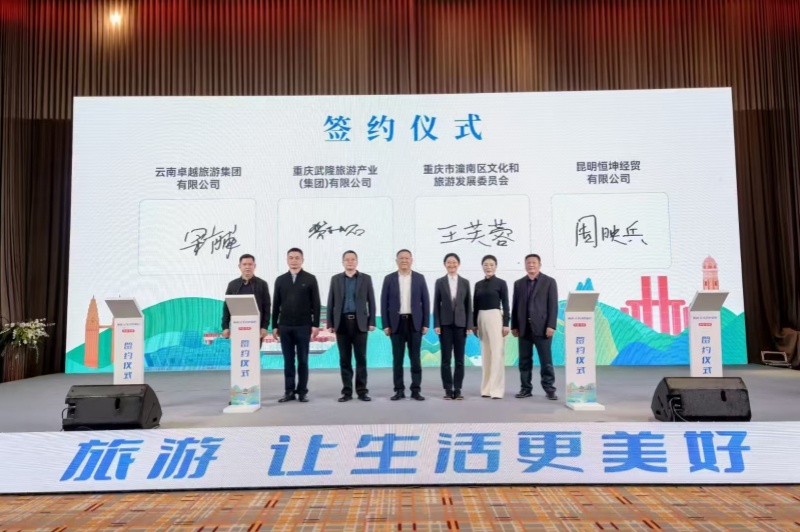 此外,在与会嘉宾的共同见证下,重庆武隆澳网官方网站产业(集团)有限公司与云南卓越澳网官方网站集团有限公司,签署了合作协议。双方表示,将一如既往地保持战略合作关系,把握渝昆高铁开通的契机,共同推动“武隆+”线路产品在云南市场的推广与销售,为两地文旅企业的合作共赢树立典范。