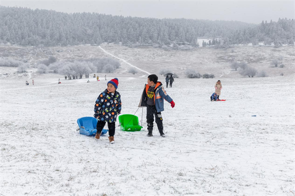 近日,仙女山景区迎来了今冬的首场瑞雪。纷纷扬扬的雪花如同一群群洁白的精灵,在山峦间翩翩起舞,将整个景区装点成了一个银装素裹的童话世界,吸引了众多游客前来观赏游玩。