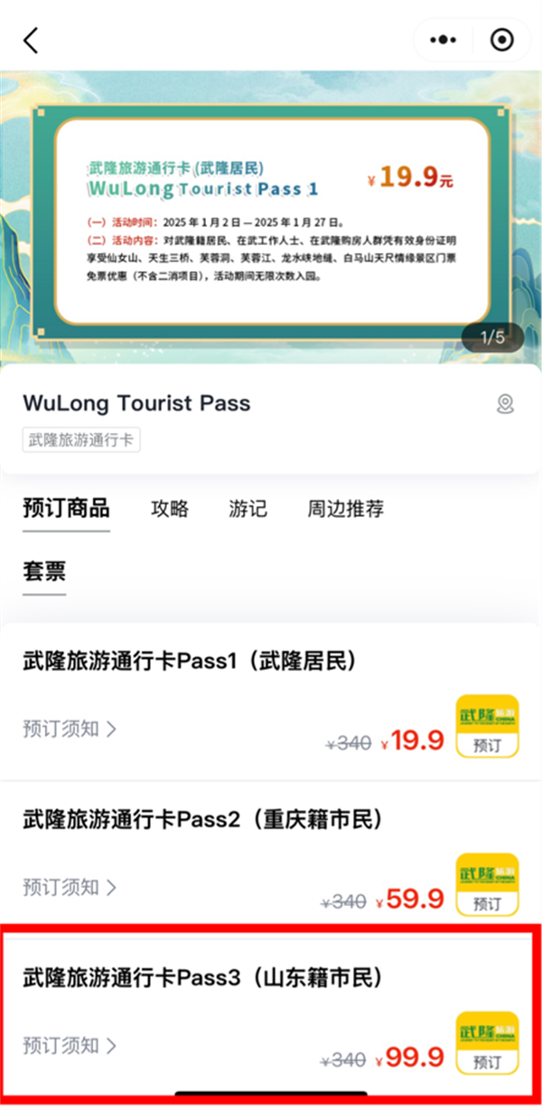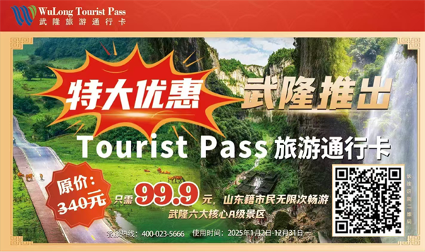 那么,这份令人心动的99.9元优惠政策究竟是什么呢?2025年元旦,重庆武隆景区隆重推出“WuLong Tourist Pass3”山东籍专享套票!全年每人仅需99.9元,即可获得含仙女山、天生三桥、龙水峡地缝、芙蓉洞、芙蓉江、白马山天尺情缘景区的门票套票,活动期间可无限次数入园。2025一整年的时间,可以随心所欲地穿梭于重庆武隆的绝美自然风光之间,感受大自然的鬼斧神工与无限魅力。