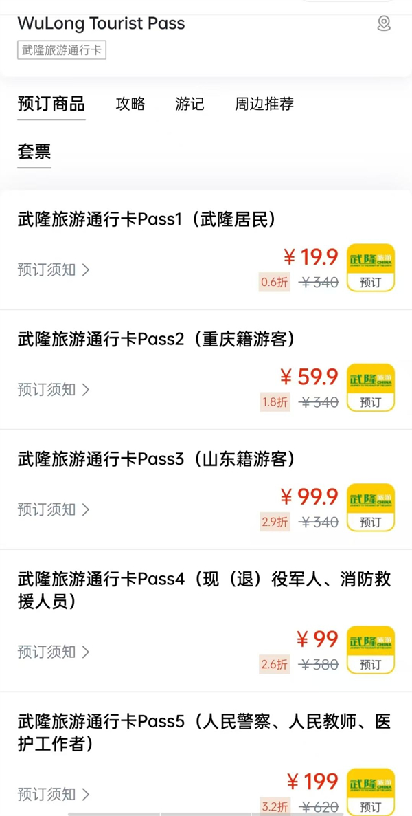 原价340元的仙女山、天生三桥、芙蓉洞、芙蓉江、龙水峡地缝、白马山天尺情缘六大核心景区,满足条件的在武人士,只需19.9元就可购得(当月无限次入园)。