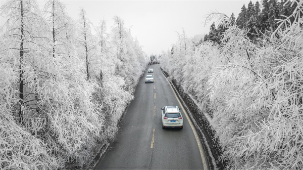 从仙女山景区南门进入景区,道路两侧的树木披上了厚厚的雪白衣袍,一路向前,绝美雾凇景观一一展现,一步步走入仙女山冰雪仙境。
