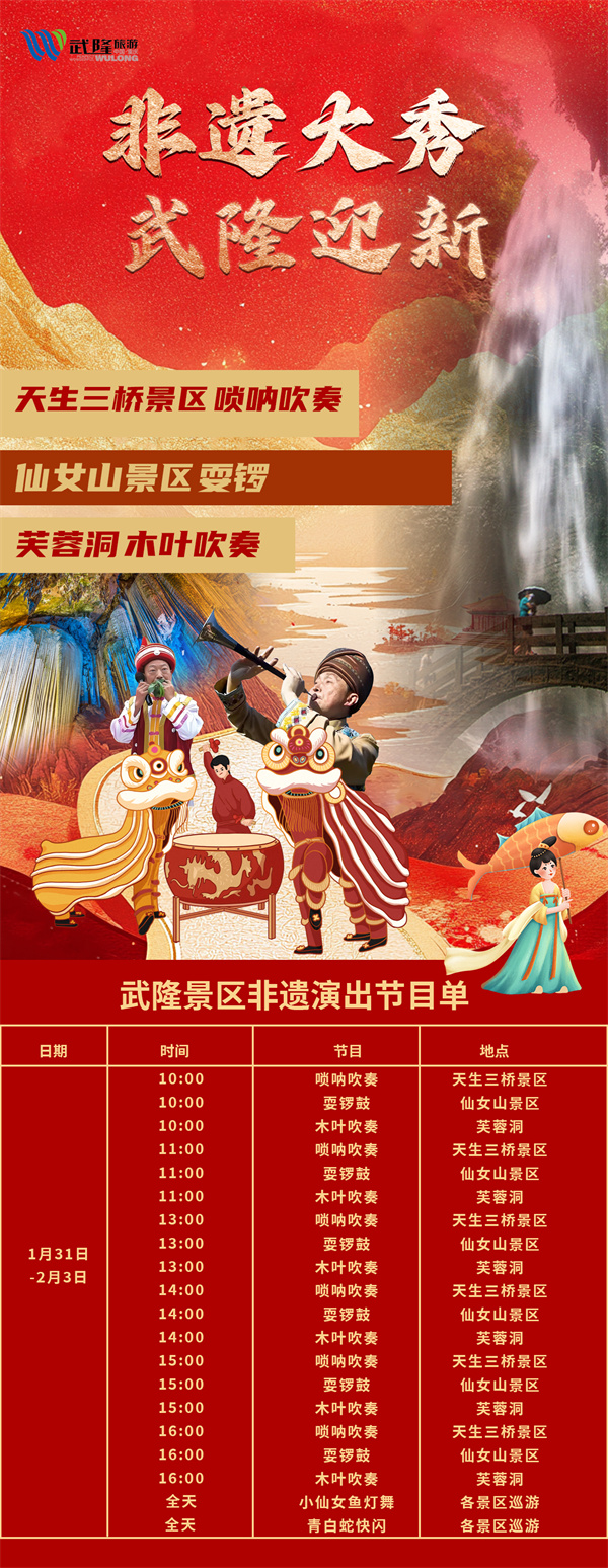 你心中的非遗演出是怎样?非遗吹打不仅是艺术的展示,更是文化的传承,古老艺术与自然山水间会碰撞出怎样的火花?想象一下,悠扬的唢呐声划破宁静,仿佛能唤醒山间的每一寸土地,古老与现代在这一刻交融;木叶吹奏如清泉般流淌,每一片叶子的轻吟,都是大自然最质朴的乐章;热烈非凡的耍锣鼓点燃热血,让人豁然开朗。这个春节,仙女山、天生三桥、芙蓉洞等地将有超多非遗演出静候您的到来,不见不散!