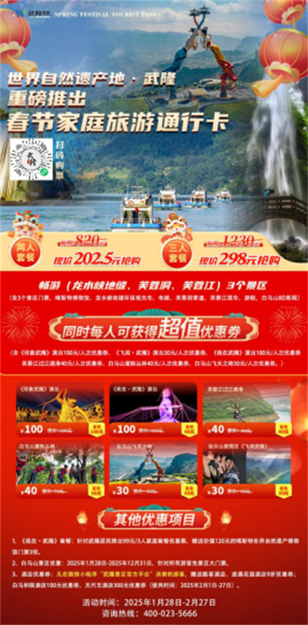 春节将至,如果您计划前往武隆游玩,一定要记得带上“WuLong Tourist Pass—春节家庭澳网官方网站通行卡”,有了它,您能享受到超多优惠福利,就像薅羊毛一样,让您轻松薅到手软。据介绍,2025年1月28日至2月27日,原价820元、1230元的两人和三人套餐,只需202.5元和298元拿下,低至2.4折。套餐包含龙水峡地缝、芙蓉洞、芙蓉江3大景区(含门票、电梯、环保观光车、索道、缆车),以及武隆喀斯特世界自然遗产博物馆和白马山8D影院。更令人惊喜的是,购买以上套餐后,还可分别享受680元和1020元的优惠大礼包,涵盖《印象武隆》《我在武隆》《飞阅武隆》、芙蓉江过江速滑、白马山飞天之吻、冒险丛林多个热门项目,让您以超值的价格,尽享武隆的绝美风光和丰富体验。