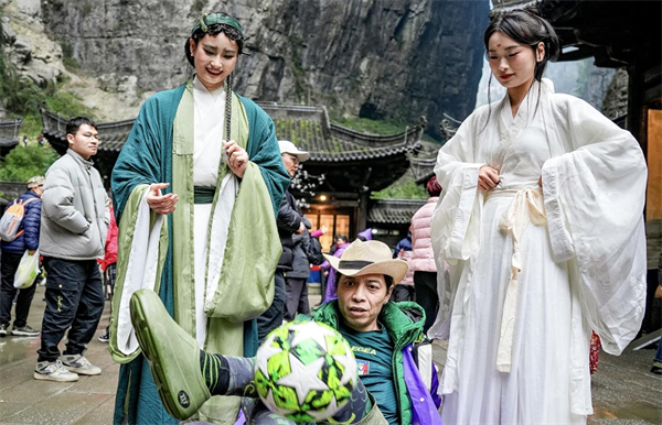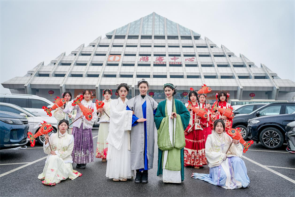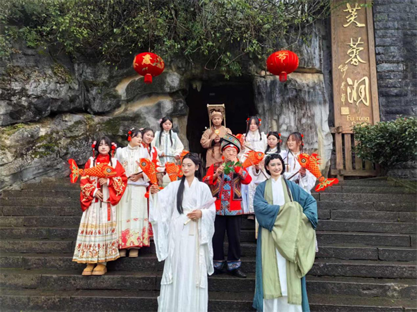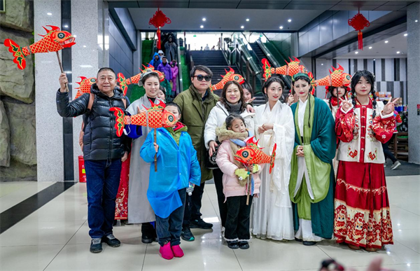 在鬼斧神工的天生三桥底下,一群身着轻盈罗裙的仙女儿们手持鱼灯翩翩起舞,灵动的舞姿与青砖黛瓦相互映衬,宛如一幅美丽的画卷。而《白蛇传》中的“青白蛇”也现身天福官驿内为蛇年春节增添了独特的氛围,白娘子带着妹妹小青穿越到驿站内与现代游客互动,展现出别样的活力。