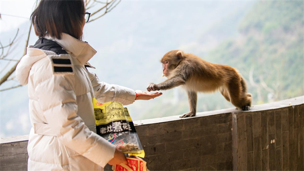 瞧,云雾悠悠地在山间翻涌,一只小猴子稳稳蹲在芙蓉洞古雅的栏杆上。向游客朋友们说道:“你们吵到大王休息了,大王派我来巡山。”睁着滴溜溜的眼睛,把这山水景致和热闹场景细细“巡查”。