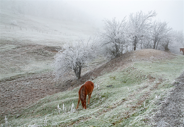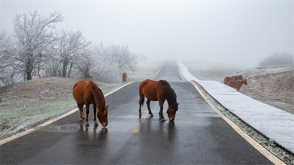 走进仙女山大草原,远处的树枝上、草丛间已经有了星星点点的白色,仿佛是大自然这位神奇的画家,用白色的颜料随意挥洒,勾勒出了一幅绝美的冬日画卷。雨滴夹杂着细小的雪花飘落,打在身上,带来丝丝凉意的同时,更增添了一份惊喜。在这里,你可以肆意奔跑,与这片纯净的白茫茫世界亲密接触,感受冬日特有的那份宁静与祥和。此时,不妨拿出你的手机或相机,记录下这难得一见的美景。