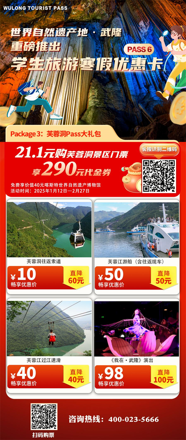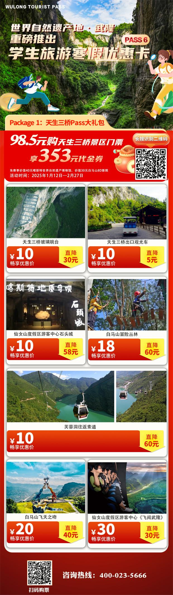 时光如逝,光阴如梭。同学们,寒假余额已经开始疯狂倒数啦,专属于你们的、0元起购的武隆澳网官方网站福利,也即将和这个美好的假期一起说再见咯。赶快带上身份证、学生证,抓住寒假的尾巴,开启一场超值的世界自然遗产地·武隆之旅吧!