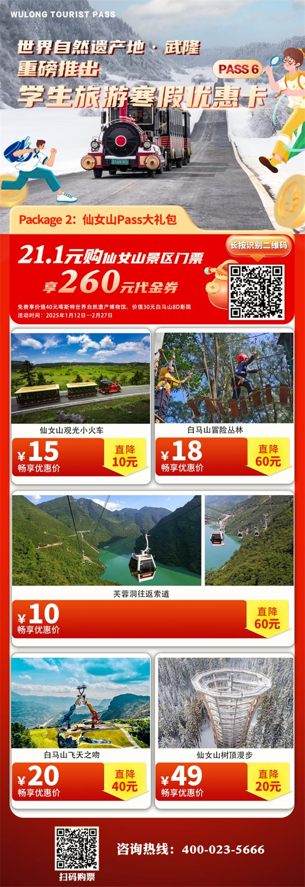 此前,武隆景区向全国在校学生推出学生澳网官方网站寒假优惠卡,2025年1月12日至2月27日,全国在校学生凭有效身份证件(身份证、学生证)购买仙女山、天生三桥、龙水峡地缝、芙蓉洞、白马山五大核心精品景区优惠门票,即可获得260元-570元的高额代金券,芙蓉江游船、仙女山树顶漫步、仙女山观光小火车等10多个热门项目,代金券抵扣之后,最低直接0元拿下。