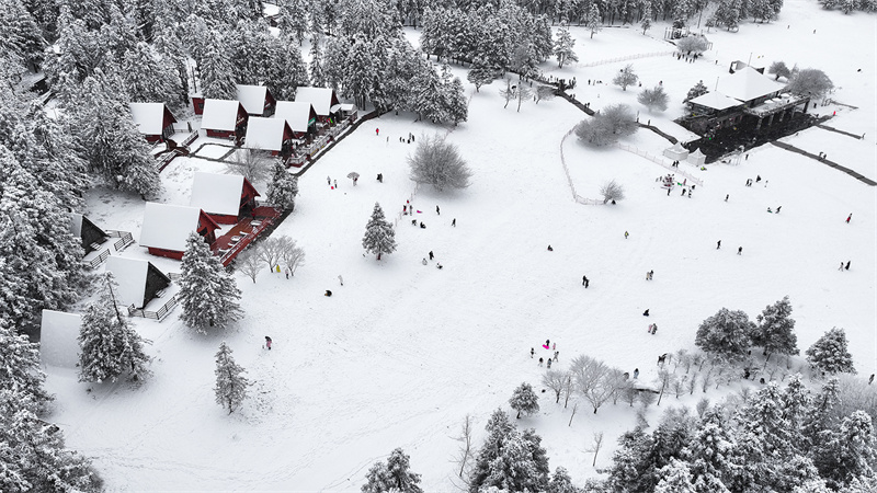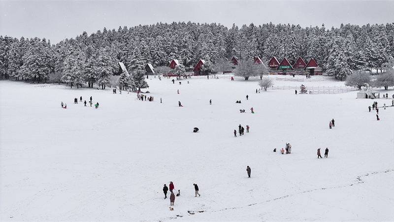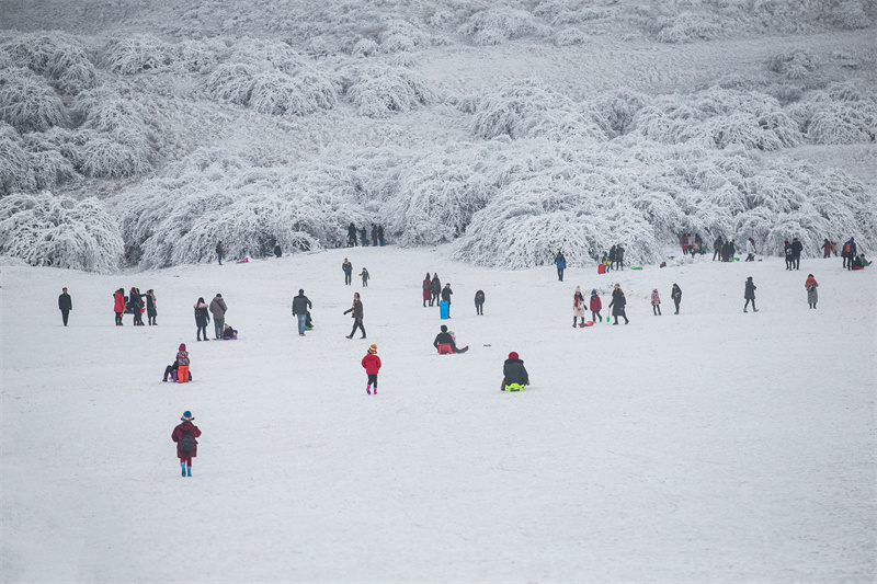 游客们被这突如其来的春雪吸引,纷纷来到仙女山赏雪游玩。他们在雪地上奔跑、嬉戏,堆雪人、打雪仗,尽情享受着这难得的冰雪乐趣。孩子们的欢声笑语回荡在山间,为这片寂静的雪景增添了生机与活力。
