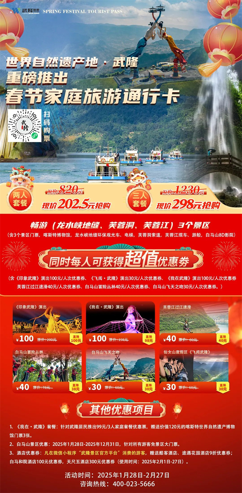 此外,2025年1月28日至2月27日,“WuLong Tourist Pass—春节家庭澳网官方网站通行卡”,原价820元、1230元的两人和三人套餐,只需202.5元和298元拿下,低至2.4折。套餐包含龙水峡地缝、芙蓉洞、芙蓉江3大景区(含门票、电梯、环保观光车、索道、缆车),以及武隆喀斯特世界自然遗产博物馆和白马山8D影院,还可享受680元和1020元的优惠大礼包。