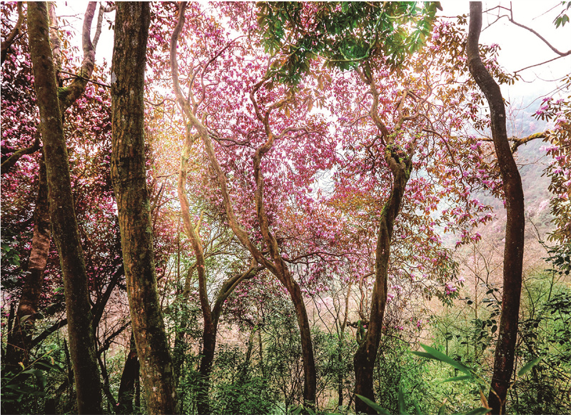 而白马山的春天,则有着另一番独特的韵味。沿着山间小道缓缓前行,茶海间的樱花树像是被春风唤醒的精灵,纷纷绽放出粉嫩的花朵。一团团、一簇簇的樱花挂满枝头,如云似雾,如梦如幻。微风吹过,花瓣如雨般飘落,洒在肩头,洒在小径上,仿佛给整个世界都披上了一层浪漫的粉色薄纱。