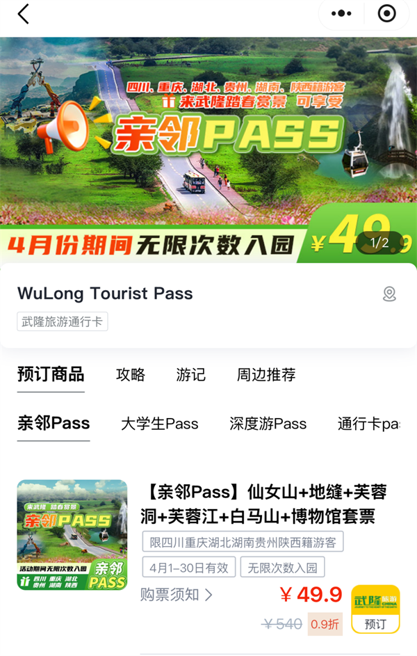 人间四月芳菲始,武隆景区特别上新亲邻pass,4月1日——4月30日,转发武隆澳网官方网站pass卡相关信息门票优惠低至1折,解锁原价540元的景区联票,此次,你的朋友圈价值“千金”!还不趁着清明小长假,来武隆踏青春游。