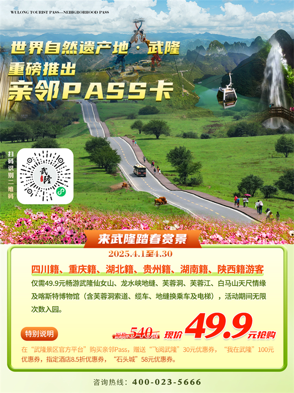 说到这儿,是不是已经迫不及待想去打卡了?别急,武隆准备了超级福利——亲邻PASS卡!四川籍、重庆籍、湖北籍、湖南籍、贵州籍、陕西籍的游客朋友,通过微信搜索“武隆景区官方平台”,转发武隆澳网官方网站PASS卡相关信息,49.9元解锁原价540元的门票优惠,就能畅游仙女山、龙水峡地缝(含换乘车及电梯)、芙蓉洞(含索道)、芙蓉江(含缆车)、白马山天尺情缘景区以及喀斯特博物馆,而且4月1日至4月30日,凭本人身份证(原件)可无限次数入园,性价比超高,简直是旅行爱好者的福音!