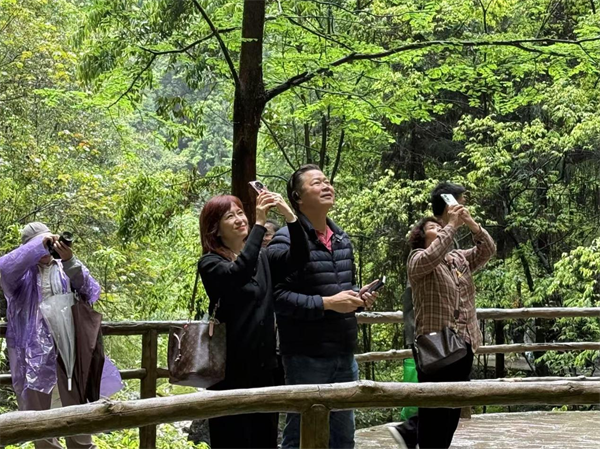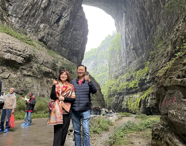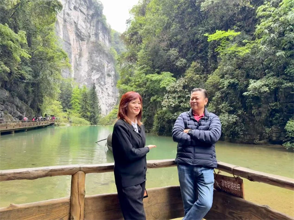 一进入天生三桥景区,赖岳谦夫妇就被眼前大自然鬼斧神工的石桥震撼到了。两人一路走一路拍,感叹道:“武隆的天生三桥太壮观了,这里的每一处景色都像是一幅绝美的画卷。”超暖心的是,赖教授还化身“拍照小老师”,现场教学游客如何拍出氛围感大片!甚至还学起武隆方言:“武隆嘿阔以!” 想着一定要推荐给台湾的朋友们!“这趟山水之旅也太有趣了,谁看了不心动?”