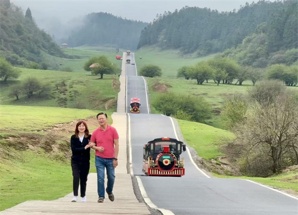 来到仙女山,赖岳谦夫妇瞬间就被这里的美景所俘获。仙气环绕、绿草如茵,赖教授一眼就认出了《难哄》的取景背景,携夫人立马拍起了同款取景地照片,夫妇二人牵手漫步在波浪公路上,他们的雀跃声回荡在整个山谷,满满的欢乐、幸福氛围溢出屏幕。赖岳谦兴奋地说:“仙女山太适合情侣拍照打卡了,天然的背景墙,绝对是浪漫天堂!”他们的分享,让无数网友对仙女山心驰神往,纷纷表示要亲自来体验一番。