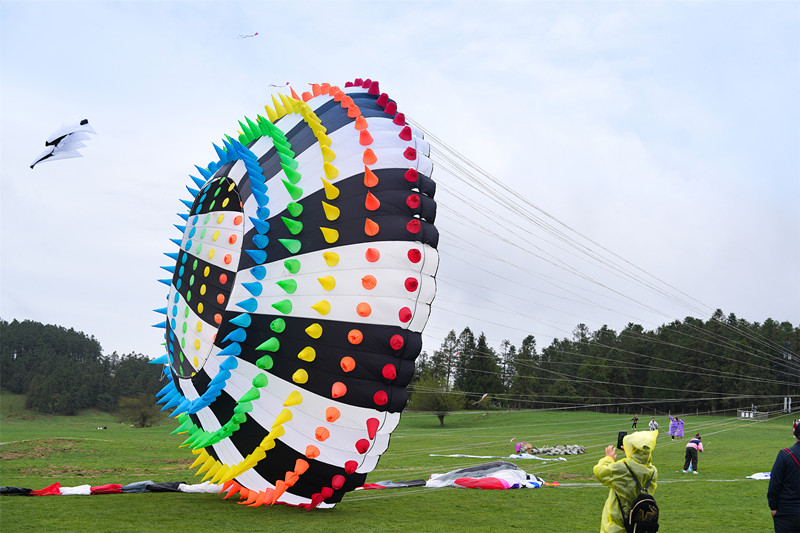最引人入胜的还属山东潍坊非遗“滚地龙”,只见其在表演人员的操控下翻滚腾跃,如彩虹旋风掠过草地,游客们争相伸手触摸这份来自“风筝之都”的祝福。在现场,旋转、俯冲、急剧爬升……这些看似风筝不可能完成高难度动作引来游客阵阵惊叹。